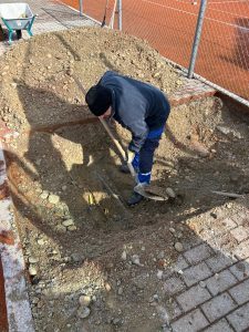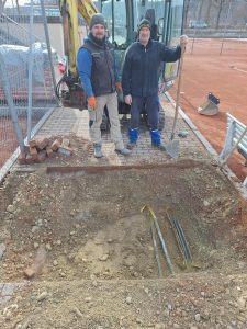 Gleich zu Beginn stand eine spannende Aufgabe an – das Auffinden der bestehenden Stromleitung, die künftig unsere Anlage versorgen soll. Mit Erfolg! Die Kabel wurden schließlich, deutlich tiefer als erwartet, im Boden entdeckt.