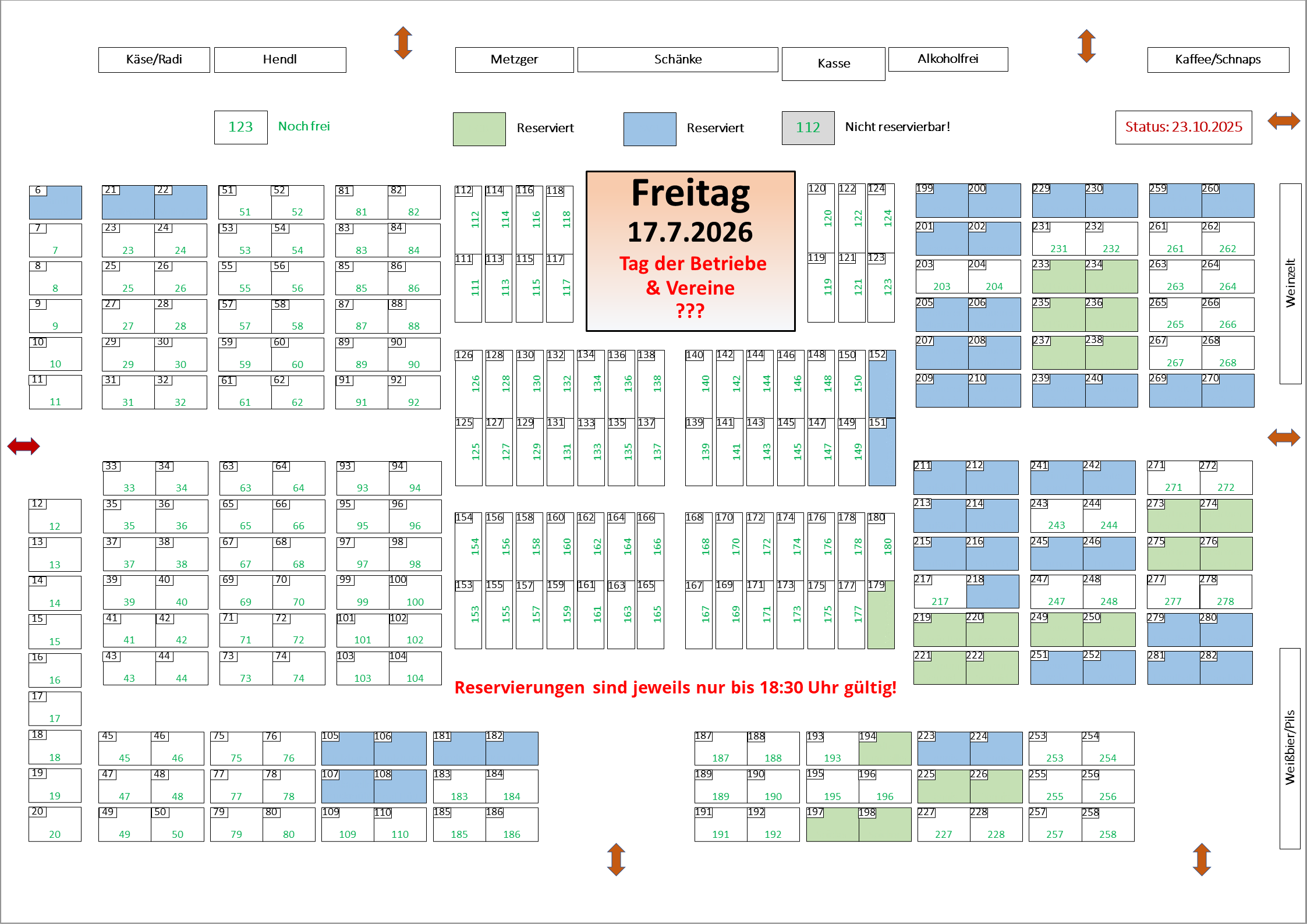 Volksfest Bruckmühl Reservierungen sind nur bis 18:30 Uhr gültig und werden ausnahmslos entfernt, falls die Tische bis dahin nicht besetzt wurden. Bitte auch nicht benötigte Tische über dieses Kontaktformular formlos stornieren. Ist der von Ihnen gewünschte Tisch bereits besetzt reservieren wir dienächste freie Tischnummer. Name* E-Mail-Adresse* Ihre Reservierungsanfrage: Ich stimme der Verarbeitung meiner personenbezogenen Daten für die Abwicklung der Reservierungsanfrage zu. 6 + 8 = Senden